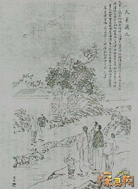 在中国清朝末年,有个叫吴友如的画家流传下来一幅画,画中就有可以看作UFO的飞行物体。吴友如给这幅画命名为《赤焰腾空》,也就是“红色的火球在天空飘浮”的意思。画的是南京朱雀桥上众人争相观看空中一团火的情景。
